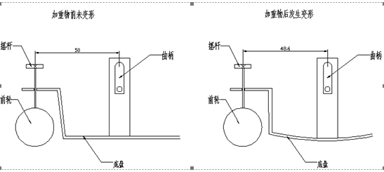这里我首先举一个例子,要求做一个水缸,甲公司负责做缸盖,乙公司负责做缸体。如果乙公司不小心把缸体做小了,当把缸盖盖到缸体的时候,可以说缸盖相对于缸体太大,也可以说缸体相对于缸盖太小。图4中机架A就相当于上例中的缸体,连杆相当与上例中的缸盖,当小车按理论值做好挂上重物后,机架A会发生如图5的变形,相对来说连杆变长了,这样小车的路线就会发生改变。所以机架A的刚度一定要得到保证。