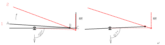 原理图如图6,首先假设连杆可以自由伸长,当摇杆中的杆A由状态1调节到状态2时,连杆被拉长了,实际中连杆可以看成刚体,那么再将连杆压缩,由图5可以看到前轮与轴线方向夹角发生了改变,这就是该机构的工作原理,其调节放大倍数为AB/BC。