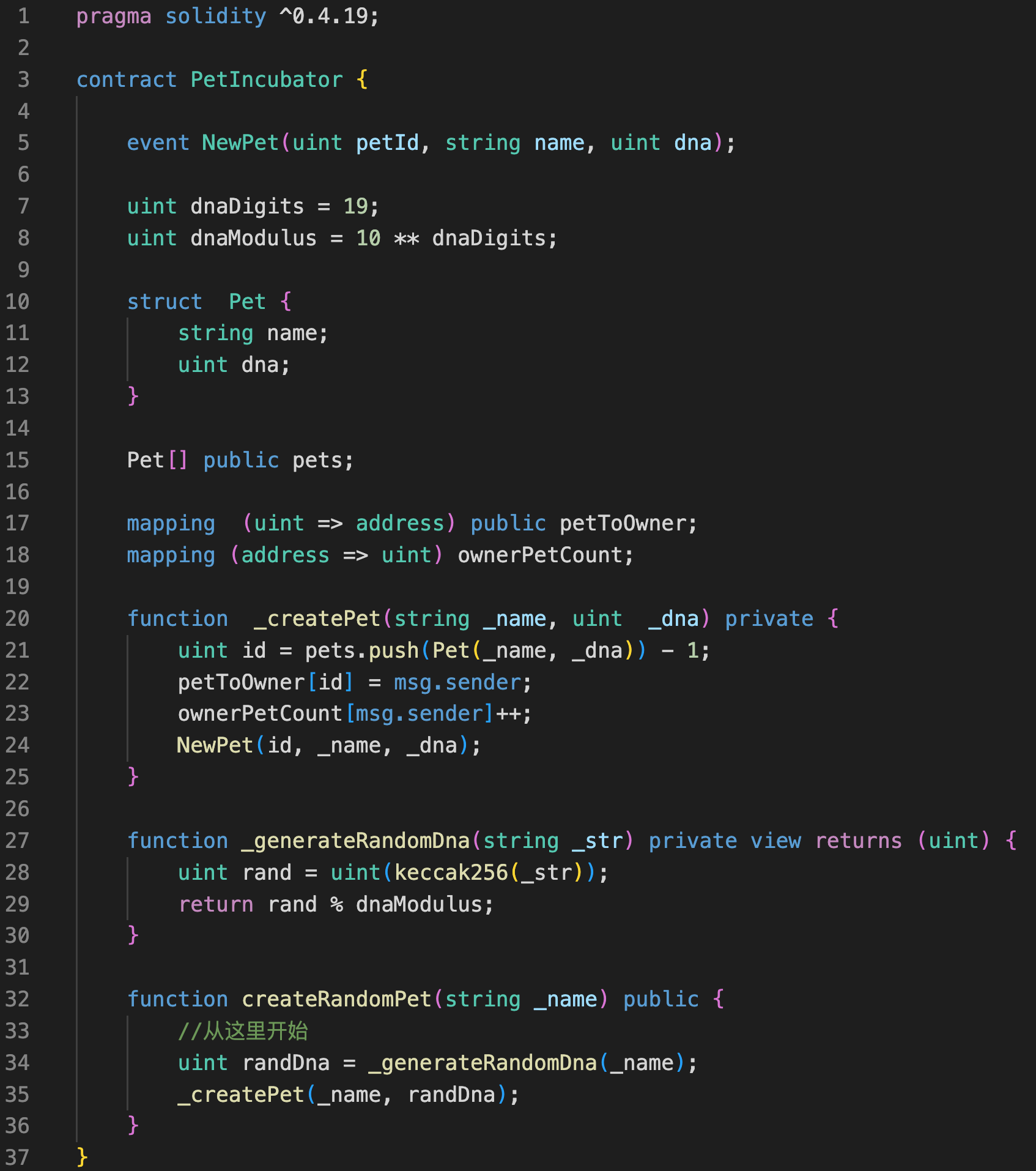 所以我们必须作出限定:每个玩家只能调用一次这个函数。 我们使用 require 来确保这个函数只有在每个用户第一次调用它的时候执行。这样一来,新玩家可以孵化他的第一个宠物。