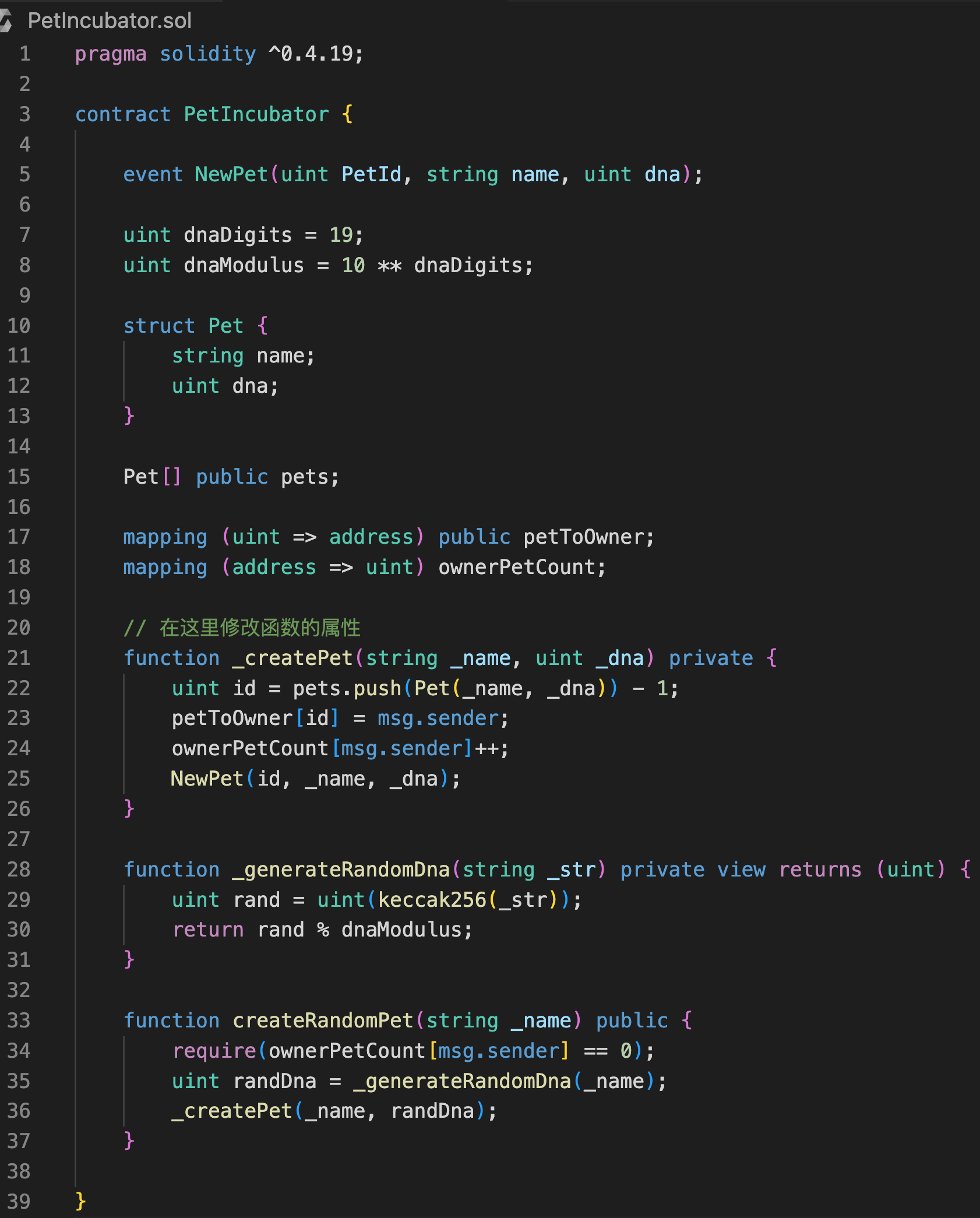 _createPet()函数的属性从private改为internal, 使得继承合约可以访问到它。