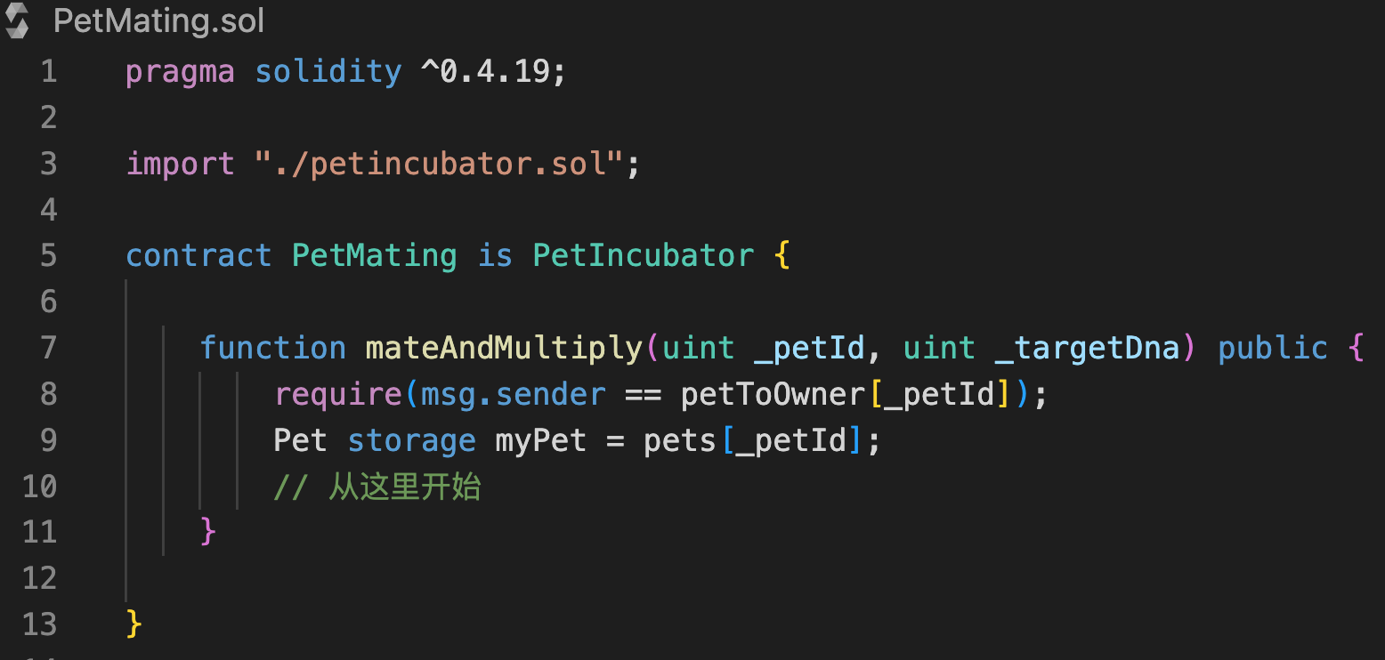 一旦我们计算出新的DNA,再调用 _createPet 就可以生成新的区块宠物了。如果你忘了调用这个函数所需要的参数,可以查看 petincubator.sol 选项卡。