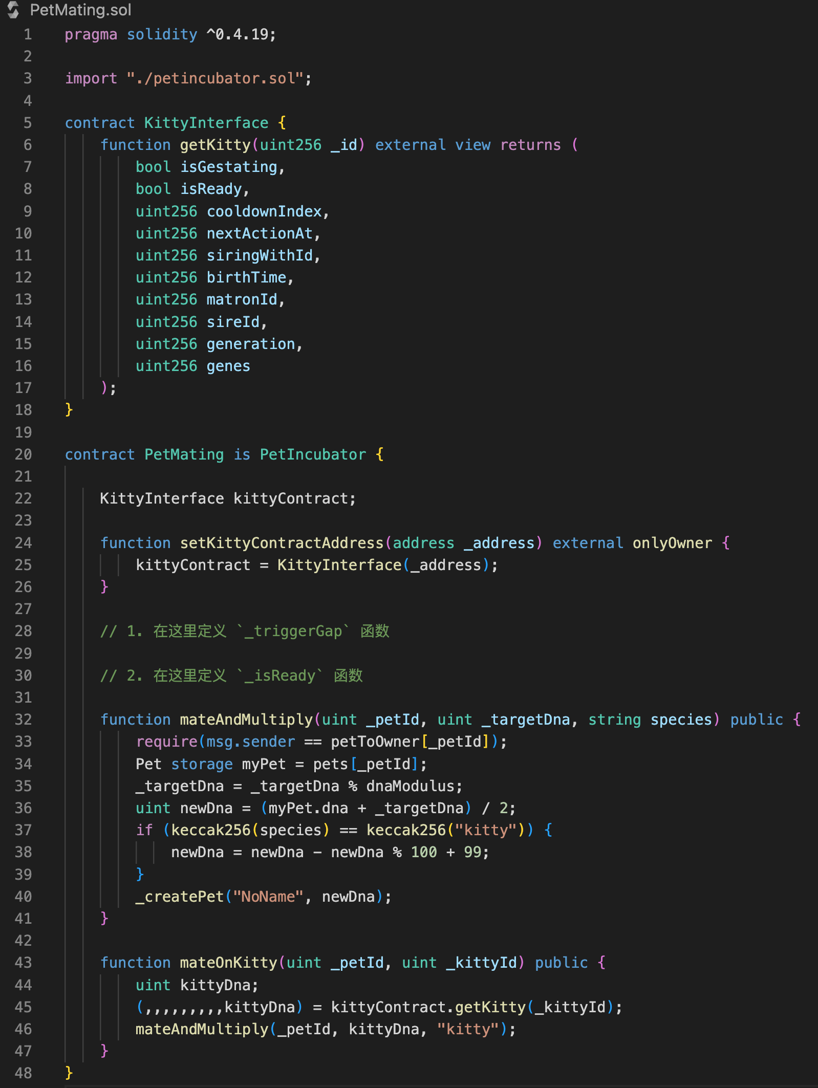 现在,Pet 结构体中定义好了一个 readyTime 属性,让我们跳到 petmating.sol, 去实现一个间隔周期定时器。