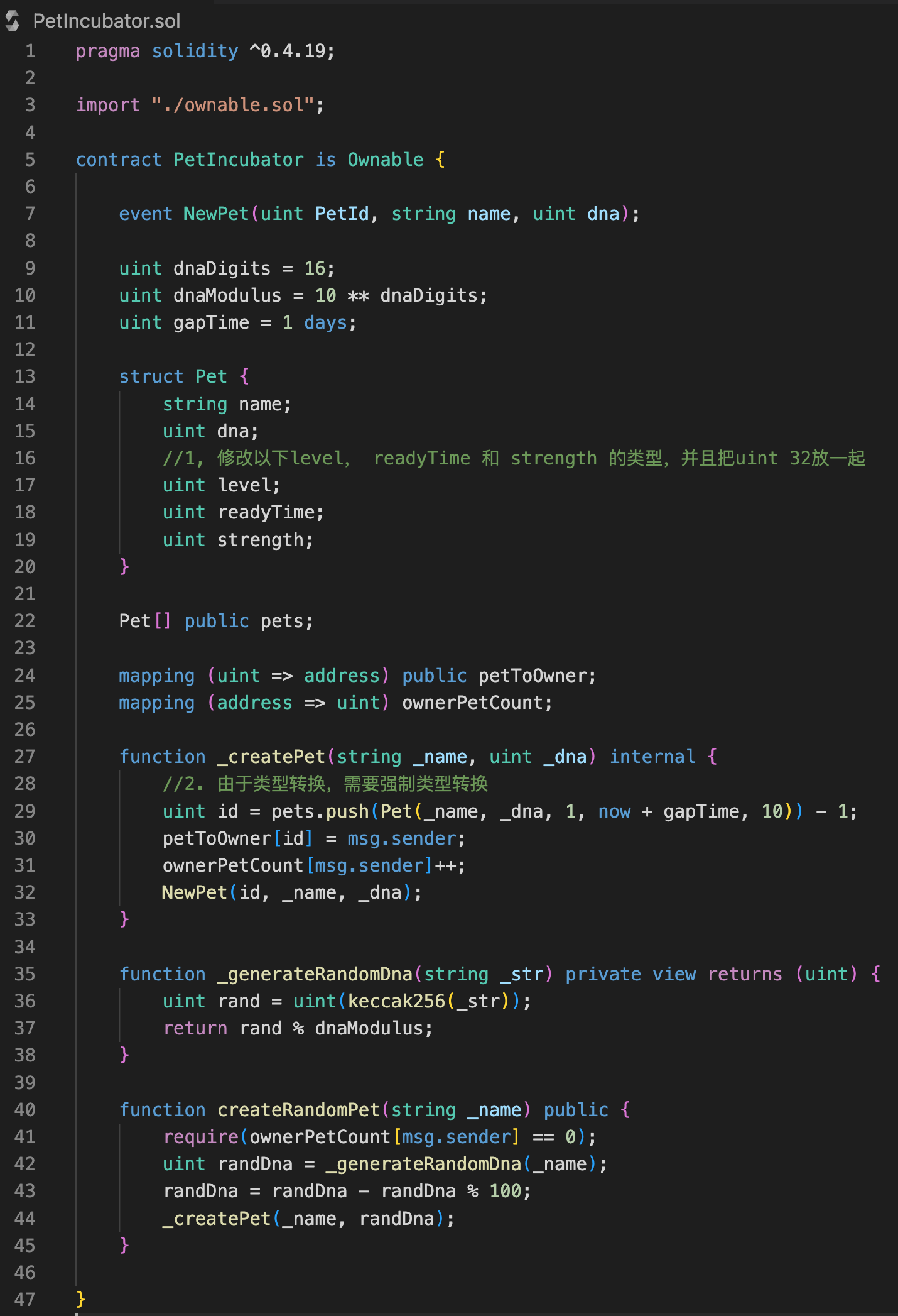 Pet 结构体属性修改:level 改成 uint32类型,readyTime 改成 uint32类型),strength改成 uint8类型。32位足以保存区块宠物的级别和时间戳了,8位也足以保存区块宠物的体力值(最大为10,最小为0),这样比起使用普通的uint(256位),可以更紧密地封装数据,从而为我们省点 gas。同时我们把level(uint32类型)和readyTime(uint32类型)放一起,因为我们希望同类型数据打成一个包来节省 gas。