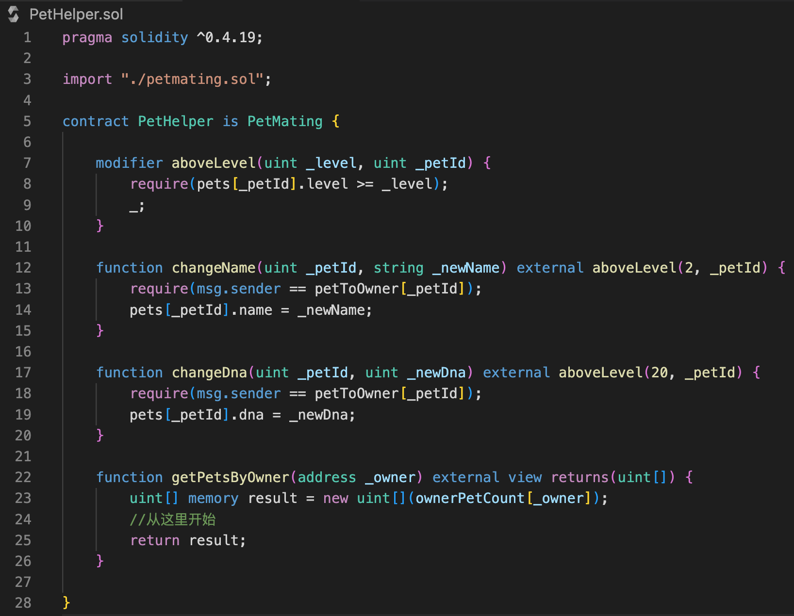 然后我们每次创建新区块宠物时,执行 ownerToPets[owner].push(PetId) 将其添加到主人的区块宠物数组中。而 getPetsByOwner 函数也非常简单: