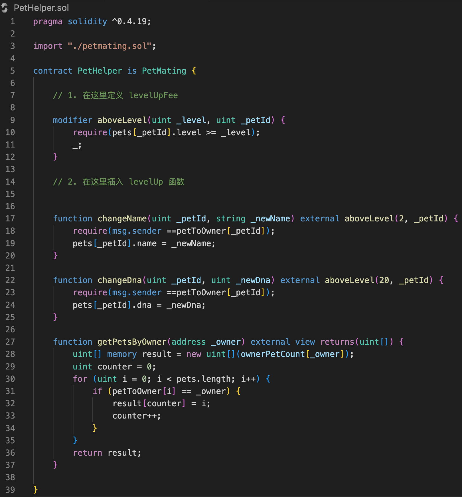 然后它应该增加区块宠物的 level, 写上pets[_petId].level++。