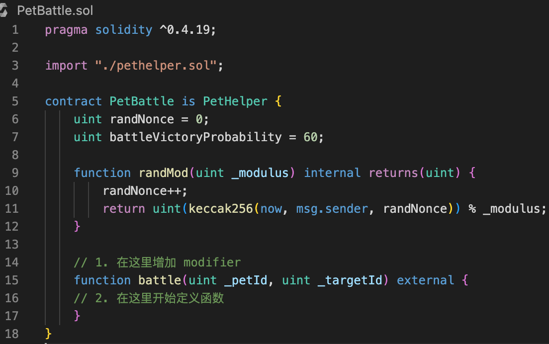 1.将 ownerOf 修饰符添加到 battle 来确保调用者拥有_petId.