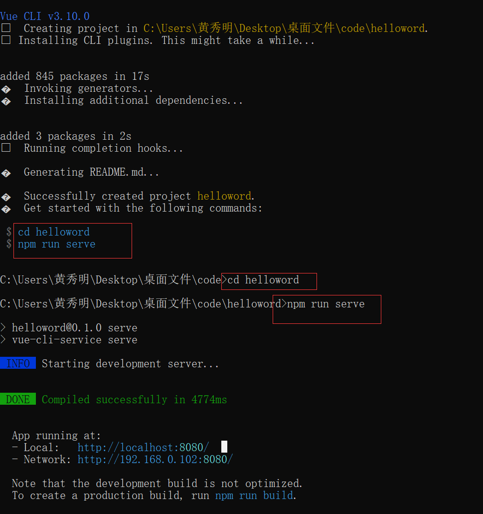 大家根据需求选择相应的配置项,一步步往后创建项目即可。项目创建成功之后,根据界面提示,可以执行如下两个命令行,进入项目目录,启动项目: