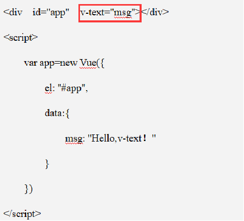 v-text用来在DOM元素内部插入文本内容,该指令以文本的方式更新元素的内容,即使是HTML代码,它也只当做普通字符串处理,不会解析标签,与插值表达式作用相同。