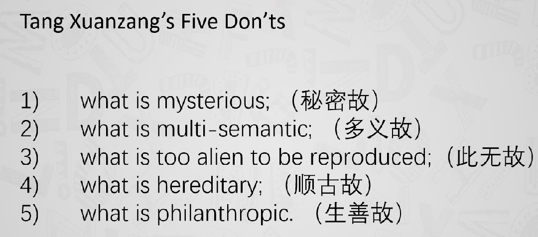 Qian Zhongshu wrote that the highest standard of translation is transformation (化, the power of transformation in nature): bodies are sloughed off, but the spirit (精神), appearance and manner (姿致) are the same as before (故我), the old me or the old self).
