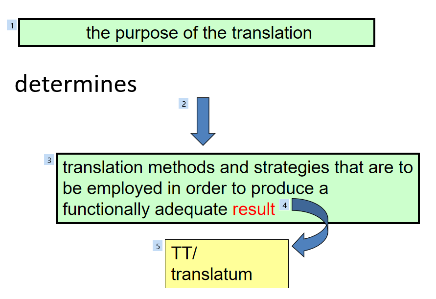 According to Skopostheorie (the theory that applies the notion of Skopos to translation) , the prime principle determining any translation process is the purpose (skopos) of the overall translational action.