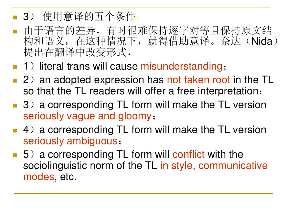 孙致礼认为意译法不拘泥于原文的表现形式,而应以传达原文的深层意思为主旨。这里的重点在于传达原文的精神主旨。