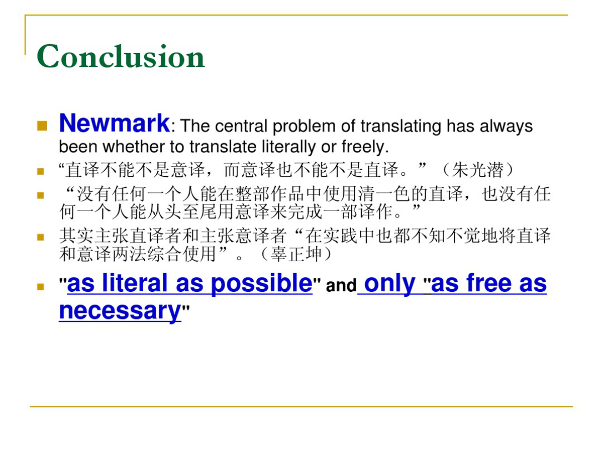 Literal translation and free translation, however, are two relative concepts. In other words, there is no absolute “literal”, nor entirely “free” version in the practice of translation, and overemphasizing either of them would result in ridiculous consequences.