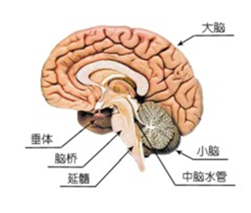 人脑很像一只放大尺寸、剥开硬壳的山西核桃,被包裹在头颅骨里面。如图所示,紧靠上面的是布满皱纹沟回的大脑,其下便是间脑(丘脑及周边组织)、脑干(中脑、脑桥、延脑)和小脑。脑干的延脑部分与脊髓相接,联络外周神经组织。