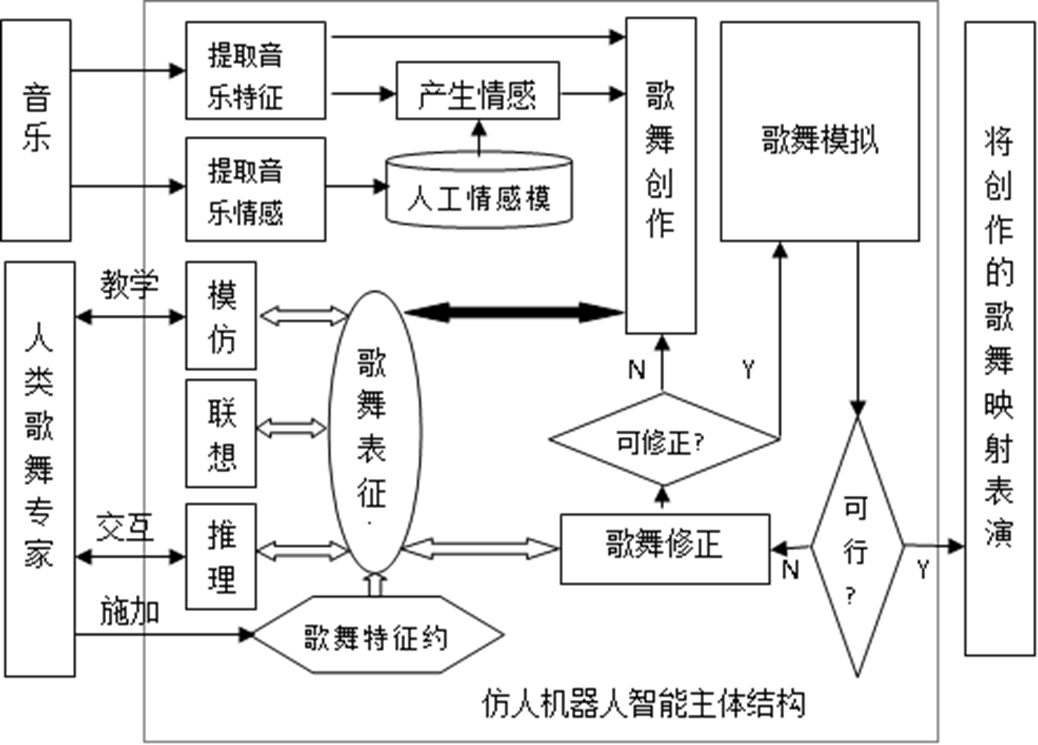 目前,仿人机器人歌舞存在的主要问题是:(1)没有考虑人类歌舞专业人员学习和创作歌舞的规律;(2)仅仅学习歌舞动作本身,而不是像人类歌舞专业人员一样通过想象来创新歌舞动作;(3)没有考虑歌舞创新和传承之间的平衡问题;(4)缺乏一种通用的仿人机器人歌舞智能学习与创作模型,可以应用于任意仿人机器人硬件平台上完成优美歌舞的学习和创作。