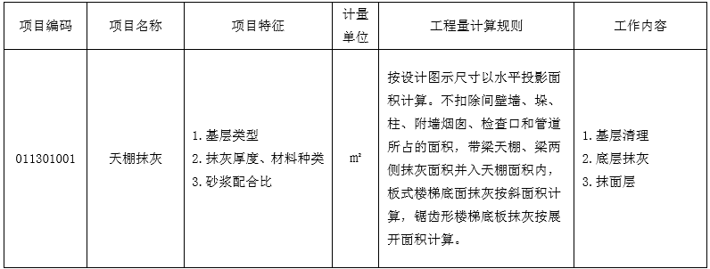 按设计结构尺寸以展开面积计算天棚抹灰。不扣除间壁墙、垛、柱、附墙烟囱、检查口和管道所占的面积,带梁天棚的梁两侧抹灰面积并入天棚面积内,板式楼梯底面抹灰面积(包括踏步、休息平台以及≤500mm宽的楼梯井)按水平投影面积乘以系数1.15计算,锯齿形楼梯底板抹灰面积(包括踏步、休息平台以及≤500mm宽的楼梯井)按水平投影面积乘以系数1.37计算。