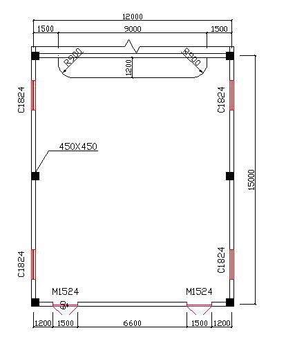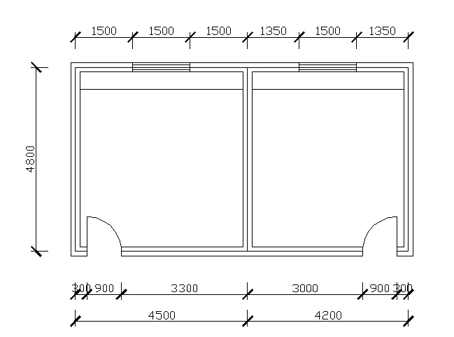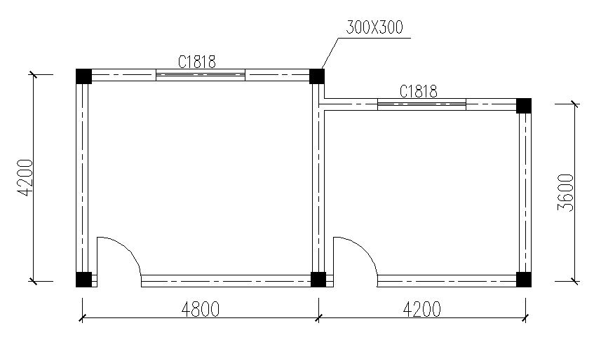 计算图示建筑内木门窗尺寸,窗高1800mm,门高2100mm。