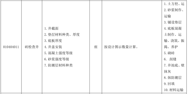 但是在清单的工作内容中我们发现清单造价包含了从土方到抹灰整个施工过程,而定额只包含了其中部分工序,因此,完整的检查井包含以下定额内容及相应工程量(按江西2005综合定额量):