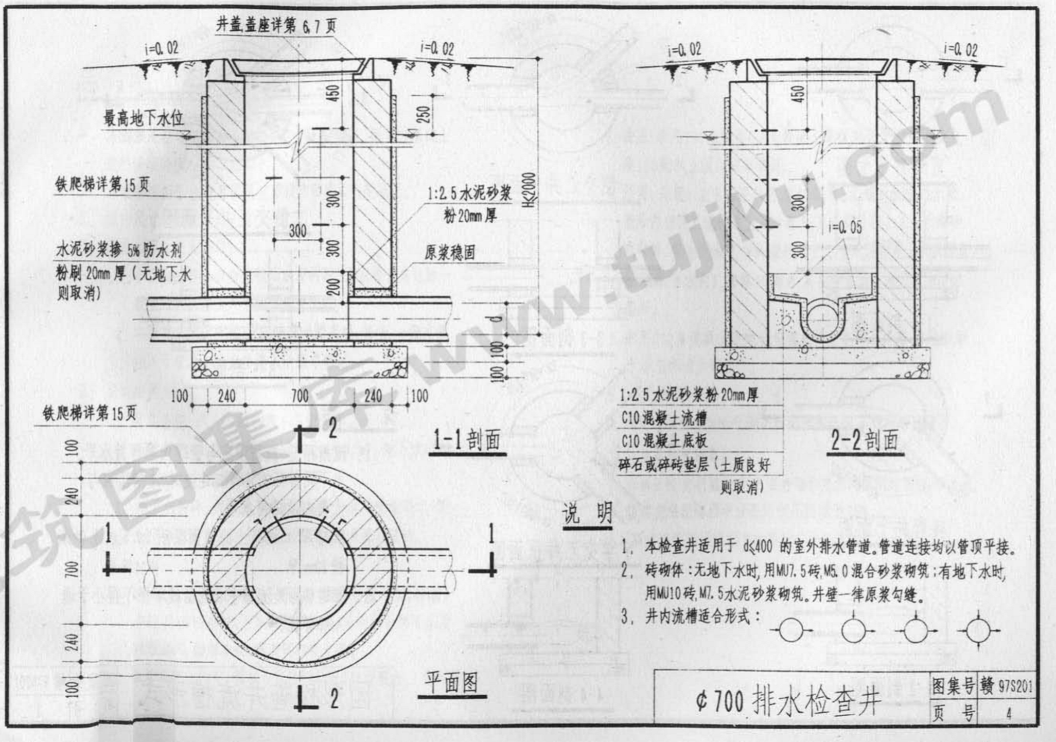 已知某工程¢700圆形雨水检查井1座,做法见标准图集97S201,如下图管径D为400MM,深度1.5m,求检查井工程量。