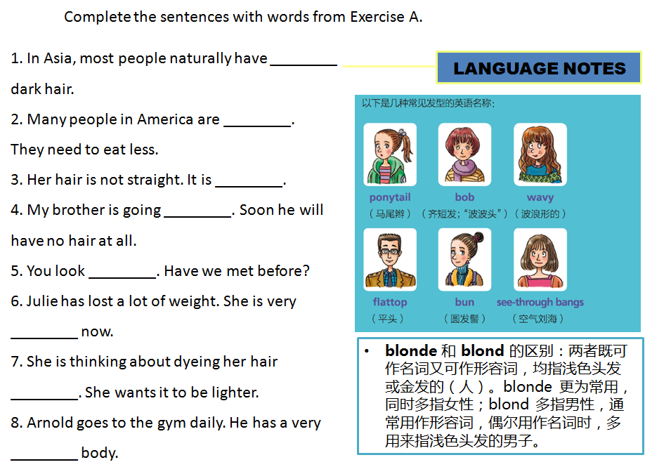 E.g.She is a pretty girl with blonde hair. 她是个有着一头金发的漂亮女孩。