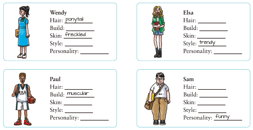 B. Make sentences to describe each person. Use the words in Exercise A to help you.