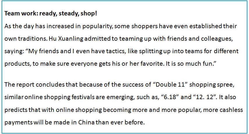 该报告在总结中表示,由于“双11”购物狂欢的巨大成功,其他类似的购物节正在兴起,如“6.18”和“双12”。报告还预测,随着网络购物变得越来越流行,未来,无现金支付在中国将越来越普及。