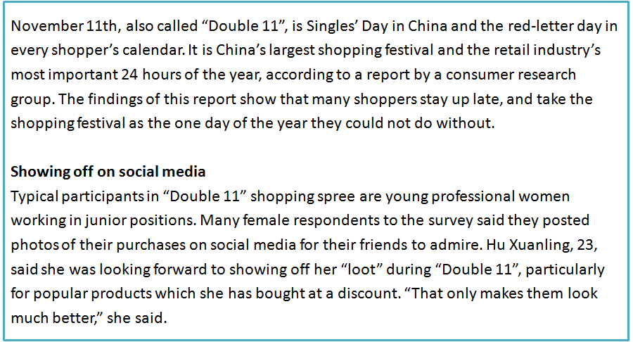 每年的11月11日又称为“双11”,这一天既是中国的光棍节,也是每个购物者心中的“大喜之日”。某消费者研究小组的报告显示,“双11”是中国最大的购物节,同样这一天对零售业来说也是一年中最重要的24小时。据该报告的调查结果显示,购物者在这一天会通宵达旦,将其视为一年中绝不可错过的一天。