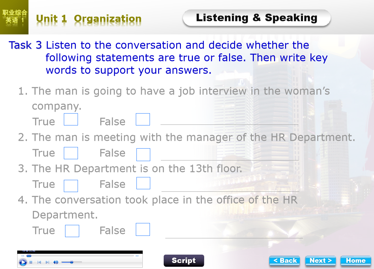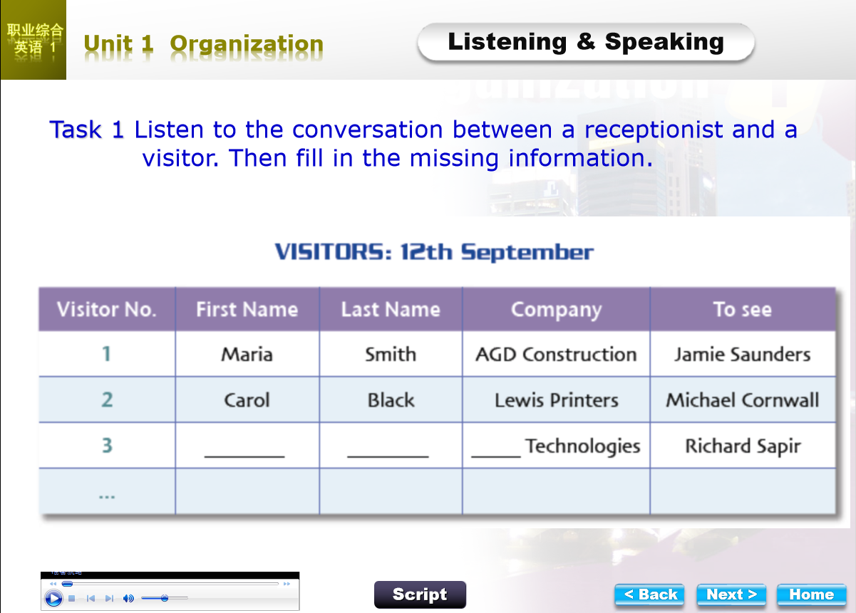 W: Good morning. How can I help you?M: Good morning. I’m looking for the Human Resources Department. I’m here for a job interview.W: Oh, I see. Would you please fill in our Visitor’s Form? Here it is.M: Sure. Thank you. Oh, I don’t know who to see, so I’ll just put HR here. Is that OK?W: Yes, that’s fine.M: Here you are. By the way, could you please tell me where the HR Department is?W: It’s on the 30th floor, the second door on your right. And the elevator is over there.