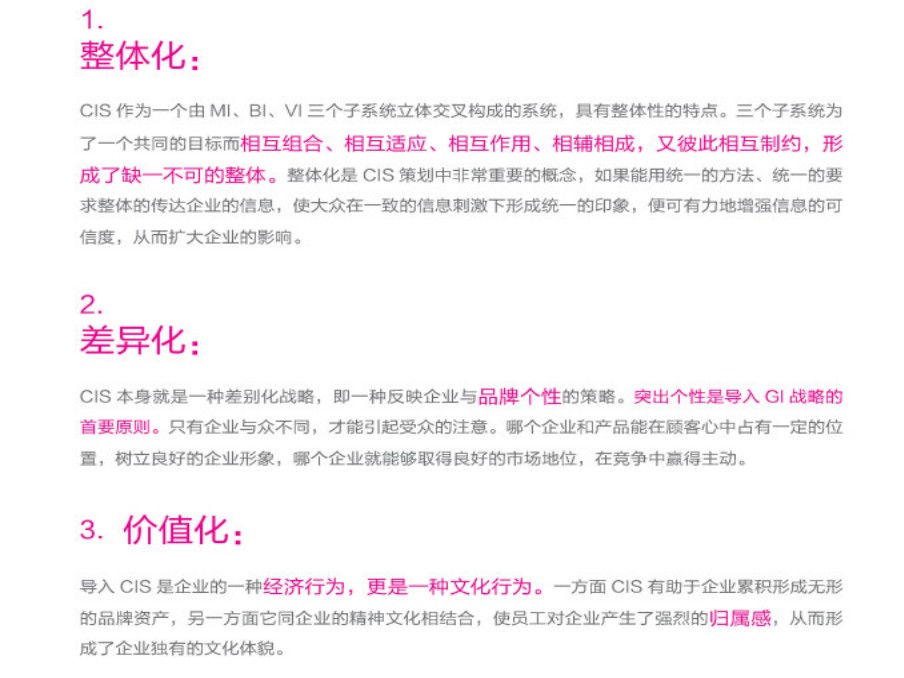 从CI的三个方面来看,它们不是相互脱节的,而必须表里一致,协调统一,BI、VI为MI服务,外美内秀,才是值得称道的。