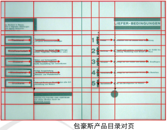 赫伯特 · 拜尔为包豪斯产品目录做的设计,显示了在抽象要素使用上的一种敏感。线段从非常粗黑到极细的变化,是一种美丽的对比。韵律和重复扮演了重要要色,形状也被重复,这既产生了一块块文字的视觉组织感,产生了强烈的垂直强调,引导读者的视线由上至下进行阅读。