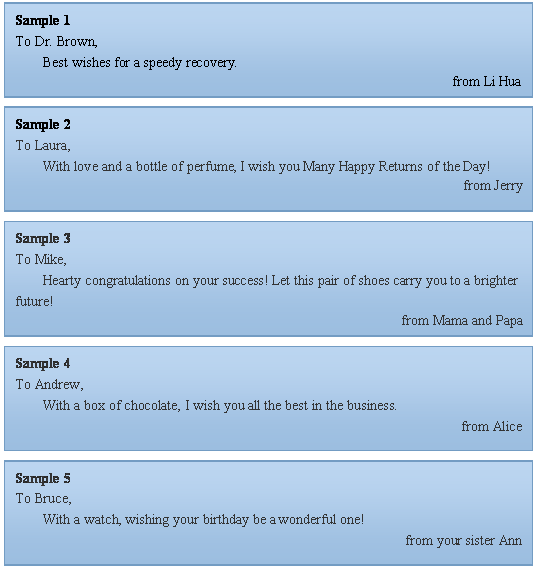 西方人在赠送礼物的时候,一般会在礼物上附带一张留言卡片。留言卡上的内容把你的祝福与礼品一起传递给对方,加深礼品的意义。下面是几张礼品卡,请注意留言的格式以及各自不同的情景。