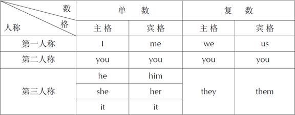 一、人称代词 表示“我”、“你”、“他”、“我们”、“你们”、“他们”的词称为人称代词。人称代词分为主格和宾格,其变化形式如下:
