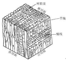 木材的宏观构造是指用肉眼或放大镜能看到的木材组织。图显示了木材的三 个切面:横切面(垂直于树轴的切面)、径切面(通过树轴的纵切面)和弦切面(平行于树轴的纵切面)。木材的宏观构造主要由树皮、木质部和髓心三部分构成。