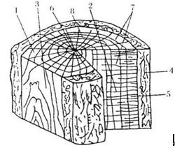 I一横切而;2—柃切时3—弦切而;4一树皮; 5一木质部;6—髓心;7 —M线;8 —年轮