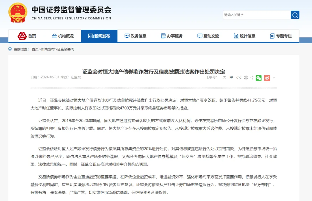 证监会方面,依法对普华永道恒大地产年报及债券发行审计工作未勤勉尽责案作出行政处罚,依据《中华人民共和国证券法》规定,没收普华永道案涉期间全部业务收入2774万元,并处以顶格罚款2.97亿元,合计罚没3.25亿元
