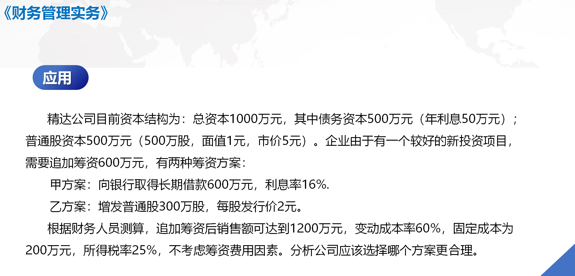 小王最近很是苦恼,他经营着一家小型企业,生意做得还算红火,订单量不断增加,利润也在逐步上升。但他看着财务报表,却总是一头雾水,不知道如何合理规划资金,优化资本结构。他手里有一些闲置资金,想扩大生产规模,却又担心资金链断裂;想投资新的项目,又害怕风险太大。就像在黑暗中摸索前行,找不到明确的方向。