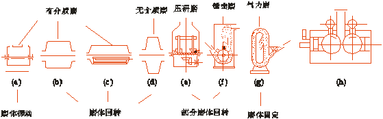 图中(a)、(b)、(c)类磨是靠研磨介质的冲击和研磨作用粉磨物料的有介质磨;(d) 类是无介质磨;(e) 类是靠压研粉磨物料的立式磨;(f)和(g)类借锤与料、料与料间撞击摩擦来粉磨物料;(h)类靠两相对回转的辊子对物料挤压来进行粉磨的。在结构上(a)、(b)、(c)为圆筒形。