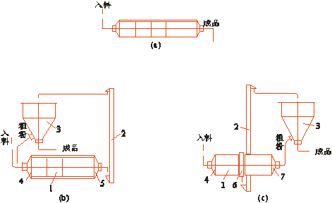 粉磨系统有开流(如图6.5(a))和圈流(如图6.5(b)、(c))两种。前者在粉磨过程中,物料一次性通过磨机后即为成品;后者是物料出磨后经过分级设备选出成品,并使粗粒返回磨内再粉磨。