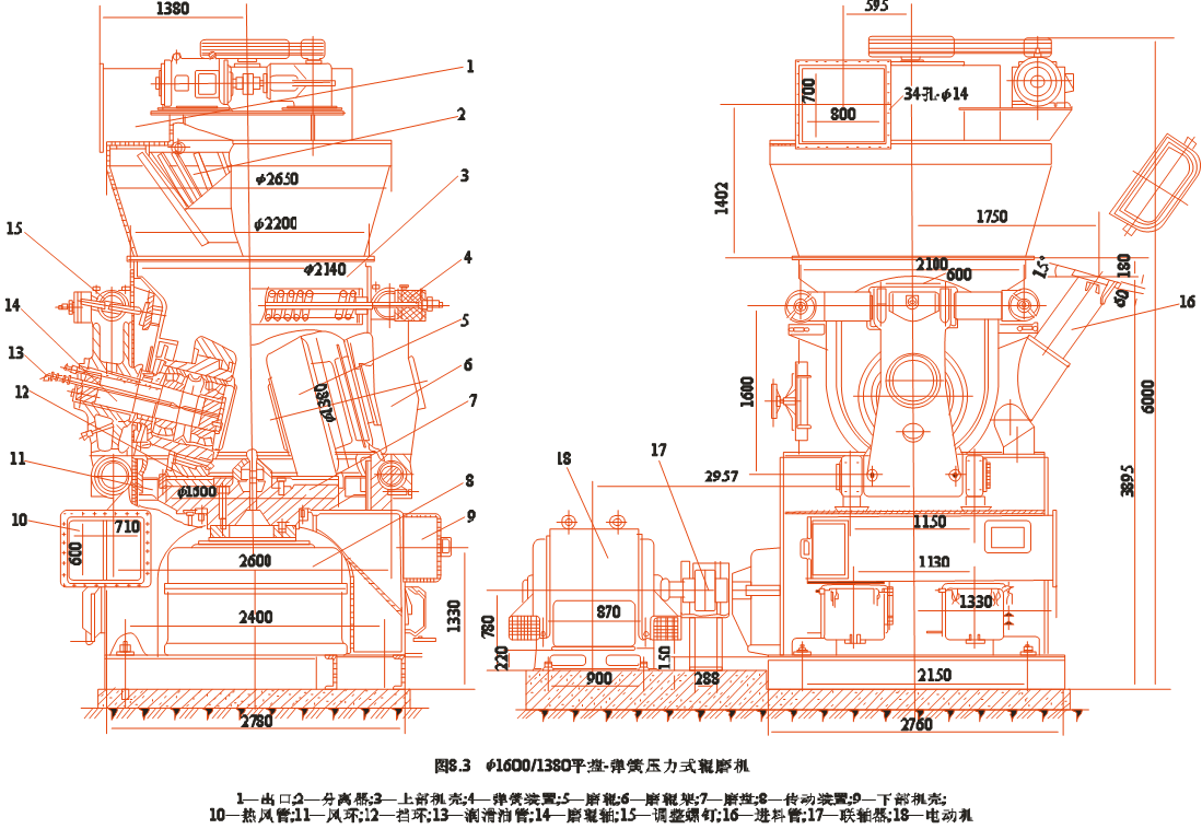 上图是Φ1600/1380平盘一弹簧压力式辊磨机的构造图。