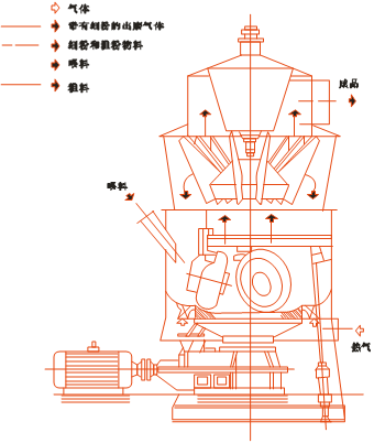 1、风环在磨盘周围设置风环11,由30°倾斜叶片组成。由磨盘下方热风道10进入的气流与水平方向成30°的角度旋转向上,气流在风环喉部的速度达50m/s时有效地阻止了物料的下落。