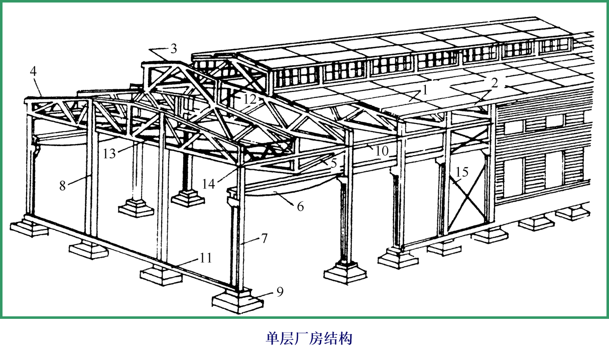 1. 屋面板 2. 天沟板 3. 天窗架 4. 屋架 5. 托架 6. 吊车梁 7.排架柱 8. 抗风柱 9. 基 础