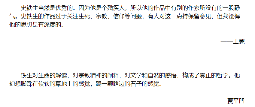 我对史铁生满怀敬仰之情,因为他不但是一个杰出的作家,更是一个伟大的人。——莫言评
