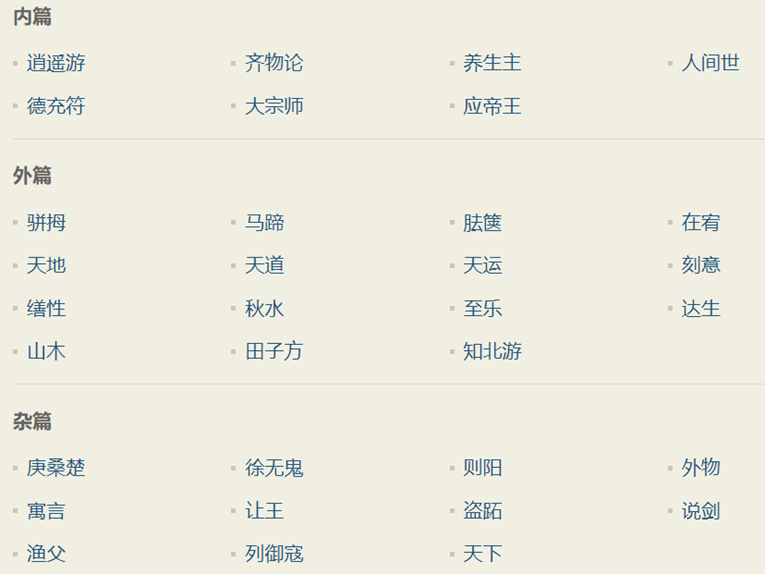 《庄子》是战国中期庄子及其后学所著道家经文。到了汉代以后,尊庄子为南华真人,因此《庄子》亦称《南华经》。其书与《老子》《周易》合称“三玄”。《庄子》书分内、外、杂篇,原有五十二篇,司马迁说“庄子著书十万余言”。乃由战国中晚期逐步流传、揉杂、附益,至西汉大致成形,然而当时流传版本,今已失传。目前所传三十三篇六万五千多字,已经郭象整理,篇目章节与汉代亦有不同。一般认为内篇的七篇文字是庄子所写,代表战国时期庄子思想核心,外篇十五篇或为庄子的弟子们所写,或者是庄子与他的弟子一起合作写成的,它反映的是庄子真实的思想;而杂篇发展则纵横百余年,参杂黄老、庄子后学形成复杂的体系,应当是庄子学派所写,有一些篇幅就认为或不是庄子学派所有的思想,如《盗跖》《说剑》等 。