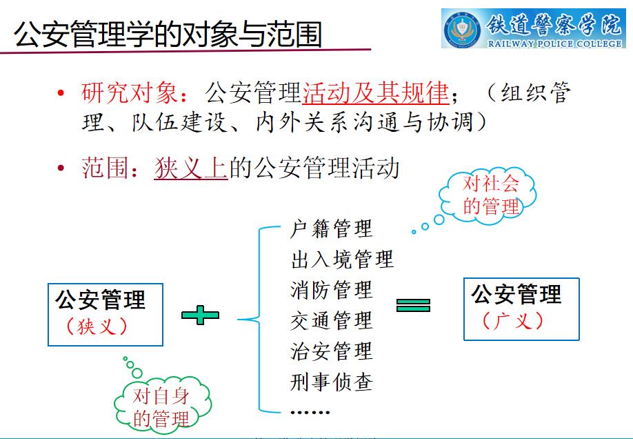 国家行政管理的重要组成部分,是公安机关为了实现各项工作的职能目标,运用现代管理科学的理论与方法,对公安工作和队伍建设所涉及的一切人、事、物、信息及内外关系等所进行的科学组织与有效协调活动。