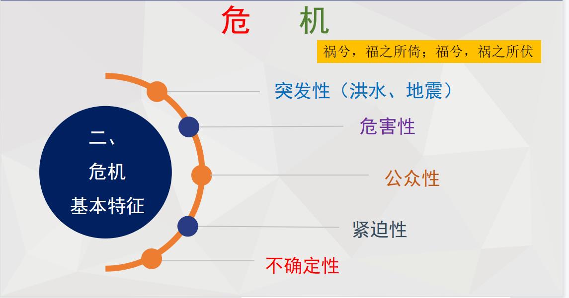在任何组织系统及其子系统中,因其外部环境或内部条件的突变,从而对组织既定系统的总目标和形象声誉等可能构成威胁和损害,要求组织在短时间内及时做出决策和采取行动的一种突发性的、具有高度不确定性和威胁性的紧急形势或紧张状态。
