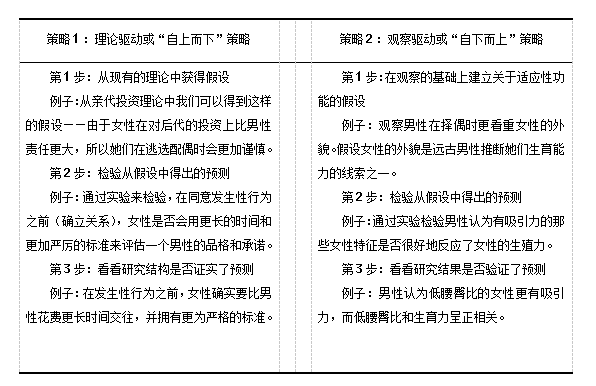 任何一门以追求科学为旨趣的学科在建立初期最本质的工作就是要形成理论假设,在进化心理学中,具体的假设主要集中于适应性问题,以及这些问题的适应性心理解决方案,即进化心理机制。为了明晰进化心理学家们是如何进行研究,我们首先要简述一下形成进化假设的两种策略。