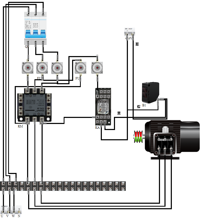 •触碰传感器→传感器接收到信号→(NPN型)传感器信号输出端与直流24V负极连接→KA线圈得电→KA的常开触点闭合→KM线圈得电→KM主触点闭合→电动机得电运行。