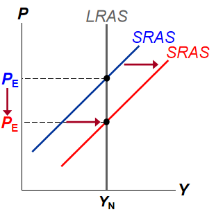 So when the expected price level decreases, wages are lower, costs decrease, and firms produce more, causing the SRAS curve shift to the right.