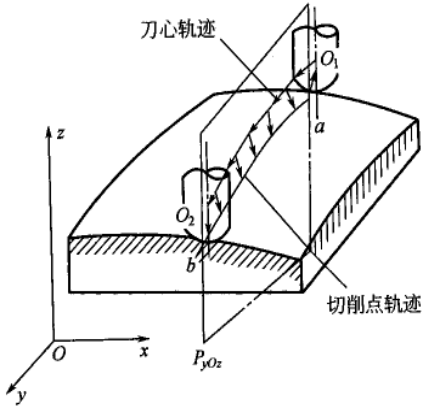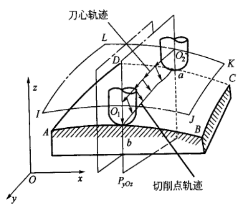 两轴半坐标联动加工曲面的刀心轨迹O102和切削点轨迹ab,如图6所示。