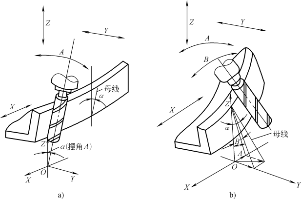 a)主轴垂直端刃加工 b)主轴摆角后侧刃加工