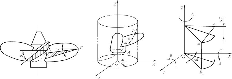 2)对曲率变化较大的变斜角面,最好用5坐标联动数控铣床,以圆孤插补方式摆角加工,如图3b所示。